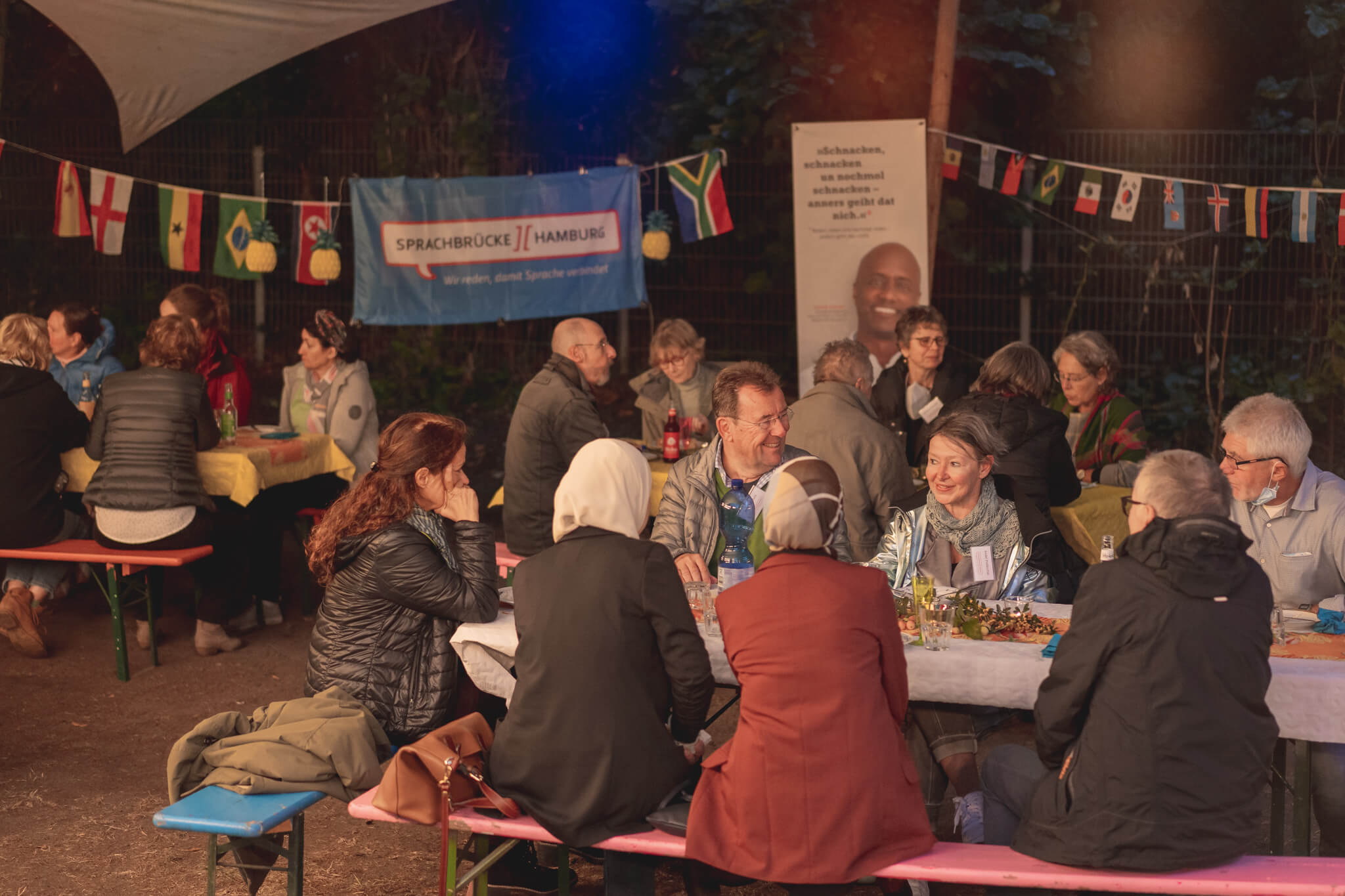 … und DANKE zu sagen. Wir haben die günstige Corona-Lage genutzt und unser Sprachbrücken-Sommerfest an einem unserer Gesprächsrunden-Orte, im wunderschönen Garten vom Café Nova auf der Veddel, gefeiert.