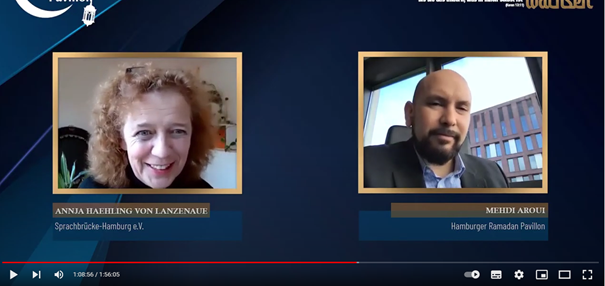 Seit vielen Jahren beteiligen wir uns am Hamburger Ramadan Pavillon, der vom Islamischen Bund e.V., bekannt als Muhajirin Moschee, stets am ersten Wochenende des Ramadan-Monats veranstaltet wird. Bis 2020 fand diese kulturelle Begegnung als Präsenzveranstaltung am Spadenteich in St. Georg statt, seitdem pandemiebedingt online. In diesem Jahr konnten wir ein Interview beitragen, das Mehdi Aroui, Vorstandsmitglied des Islamischen Bundes e.V., vorab mit unserer Projektleiterin Annja Haehling von Lanzenauer geführt hatte. Hierdurch konnten sich die Zuschauer*innen ein sehr gutes Bild von unseren Sprachangeboten und ehrenamtlichen Mitmachmöglichkeiten machen (weitere Informationen siehe hier: HHRP 2021 – Hamburger Ramadan Pavillion (hh-rp.de). Herzlichen Dank an den Veranstalter, mit dem uns eine langjährige, zugewandte Kooperation verbindet!